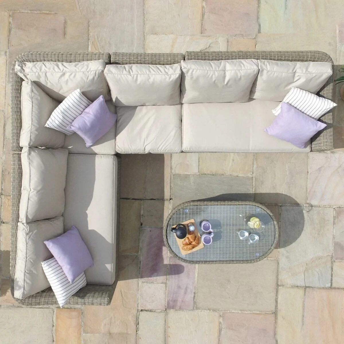 The Winchester Large Corner Group with Chair is recognisable for the thick shaped arms and backs to the set, The beige coloured cushions sit perfectly with the weave, creating a modern, elegant style. We recommend storing cushions inside overnight. It is made from the highest quality material, woven onto a powder-coated aluminium frame that ensures its use all year. The Winchester Large Corner Group is recognisable for the thick shaped arms and backs to the set. The longer side of this corner sofa can be positioned on the left or right-hand side.